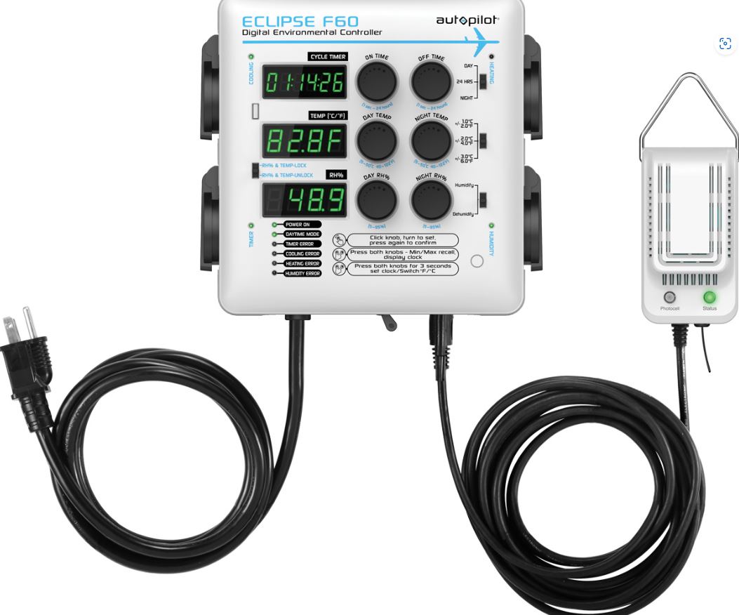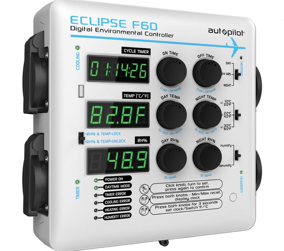The Autopilot ECLIPSE F60 Digital Environmental Controller combines precise temperature and humidity control along with cycle timing to create an intelligent yet easy-to-use unit. Three digital screens continuously display current temperature, relative humidity, and a cycle timing countdown clock. LED lights indicate active modes and inform the user of any errors.