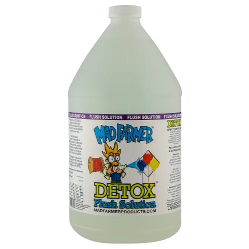 Mad Farmer Detox is a flush solution specifically formulated to dissolve and remove excess nutrient/fertilizer salts that can build up over time. Detox eliminates nutrient/fertilizer salts in hydroponic systems, potting soils, coco coir and other growing media that have accumulated over time as a result of regular nutrient/fertilizer applications. The Mad Farmer uses only the finest ingredients. No dyes are added to mask the quality and purity of the Mad Farmer Detox.