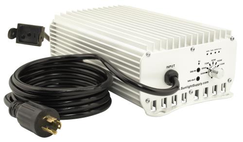 This ballast is Etelligent compatible with signal ports for on/off/dimming function. The Sun System® 1 advanced 105 kHz microprocessor is designed specifically to drive DE lamps at sustained peak performance. Sun System® 1 DE series provides premium components and superior construction for the professional horticulture enthusiast. Thermally optimized non-air cooled aluminum housing does not require a cooling fan. Internal ballast programming will protect unit in instance of open circuit, short circuit, over/under voltage or high temperature exposure. Features internal built-in circuit breaker. This Sun System® 1 ballast has dimmable/selectable wattage, turbo and built-in green LED lights for easily identified self-diagnostic performance codes. Low-current, staggered ignition delay feature eliminates circuit inrush overload and protects lamp for increased lumen maintenance. This ballast includes a prewired lamp cord receptacle that is compatible with all Sun System® brand reflectors. Includes a hard-wired 6 ft 277 volt power cord with a L7-15p 277 volt twist lock plug. The Sun System® 1 Etelligent Controller Kit #902245 (sold separately) allows up to 400 Sun System® 1 ballasts to be daisy-chained together. This controller allows wired control of the on/off/dimming capabilities of Sun System® 1 DE ballast(s). Compliant with both FCC Article 18 Part A (governs commercial use) and FCC Article 18 Part B (governs residential use) as tested by an independent U.S. testing lab in a "true as used" configuration.
